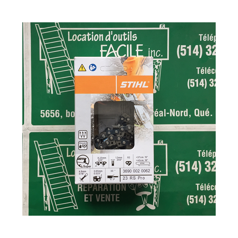 La chaîne Stihl 23RSP – .325" – 62 maillons est une chaîne de performance professionnelle conçue pour les scies à chaîne puissantes utilisées en abattage, ébranchage ou débitage rapide.