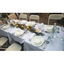 Nappe blanche 54 x 96 pouces en location, parfaite pour recouvrir une table rectangulaire de 6 à 8 personnes lors de mariages, réceptions ou événements corporatifs.